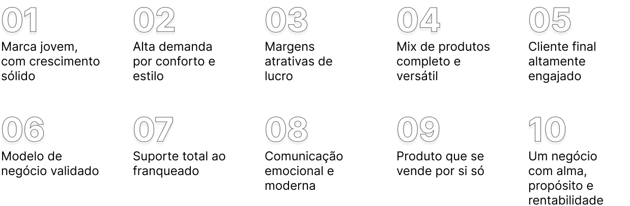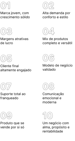 oferecemos uma marca com propósito, produtos com alta aceitação e um modelo de gestão eficiente. Nossa franquia é feita para empreendedores(as) que desejam retorno, segurança e conexão com o universo feminino e rentabilidade.